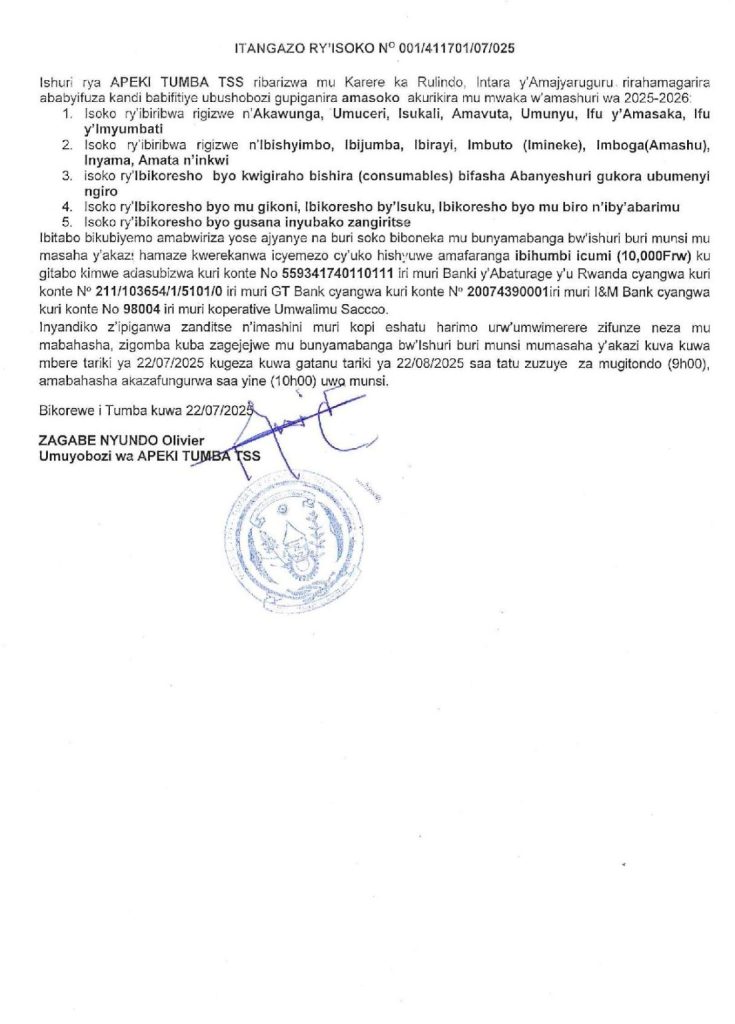 APEKI TUMBA TSS: Isoko ryo kugemura ibikoresho byo gusana inyubako zangiritse (Deadline : 22/08/2025)