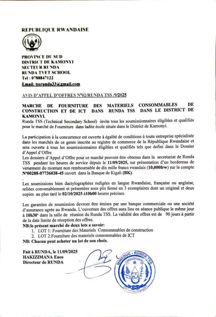 Avis d’Appel d’Offres pour le marché de fourniture des materiels consommables de construction dans le District de Kamonyi (Deadline: 02/10/2025)
