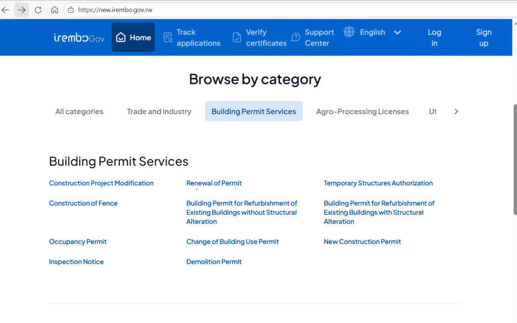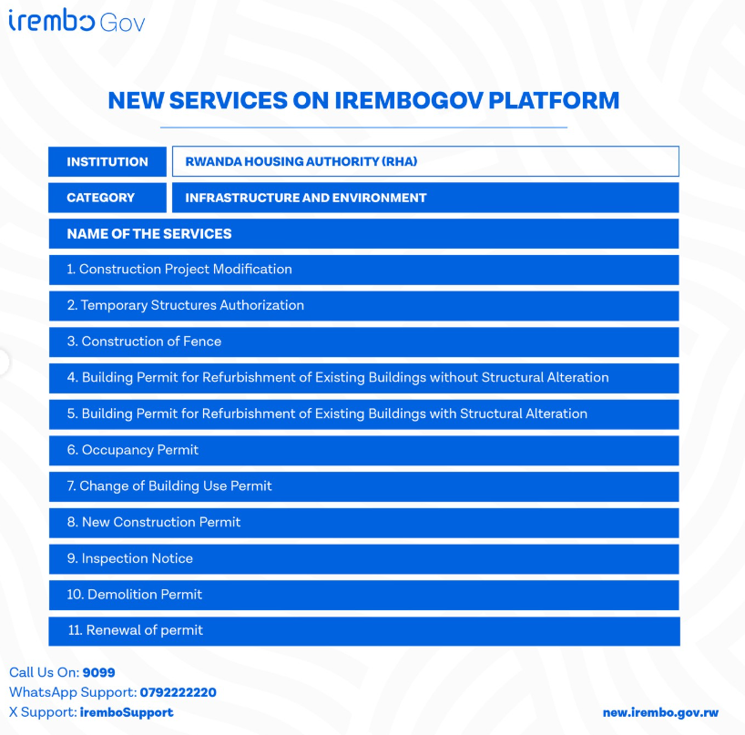 Irembo, in collaboration with the Rwanda Housing Authority (RHA), has added 11 construction-related services to the Building Permit category on IremboGov. These services include: