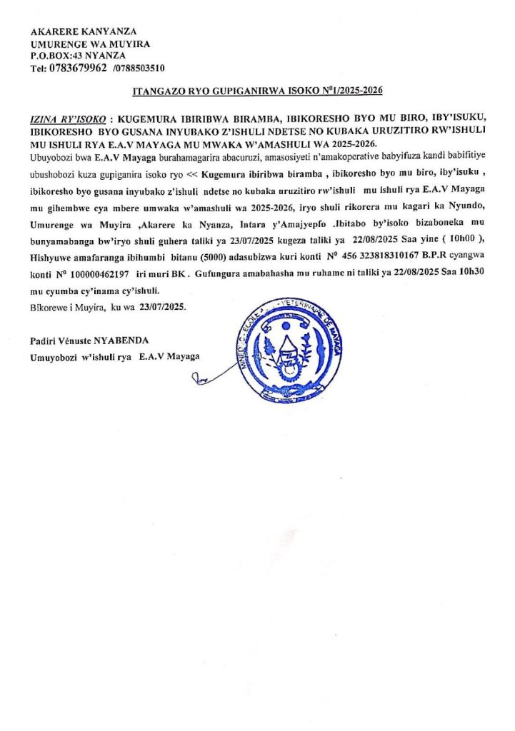 EAV MAYAGA: Isoko ryo kugemura ibikoresho byo gusana inyubako z’ishuri ndetse no kubaka uruzitiro rw’ishuri mu mwaka w’amashuri wa 2025-2026 ( Deadline: 22/08/2025)