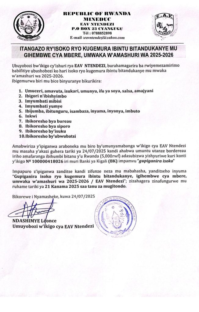 EAV NTENDEZI: Isoko ryo kugemura ibikoresho byubatsi mu mwaka w’amashuri wa 2025-2026 ( Deadline: 21/08/2025)