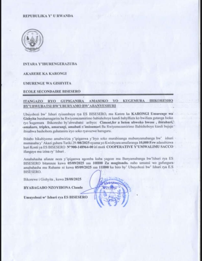 Ecole Secondaire de Bisesero: Amasoko yo kugemura ibikoresho by’ubwubatsi birimo ciment, fer a beton, ibirahure, amakaro, triplex, amarangi, amabati n’imisumari (Deadline: 05/09/2025)