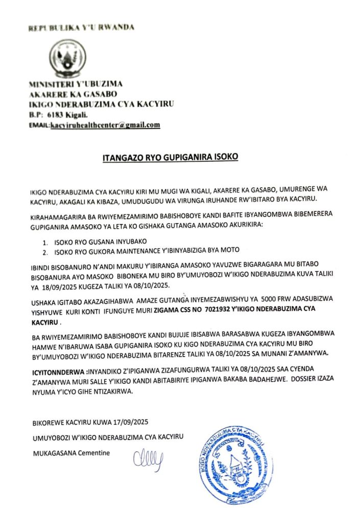 Ikigo Nderabuzima cya Kacyiru: Isoko ryo gusana inyubako (Deadline: 08/10/2025)