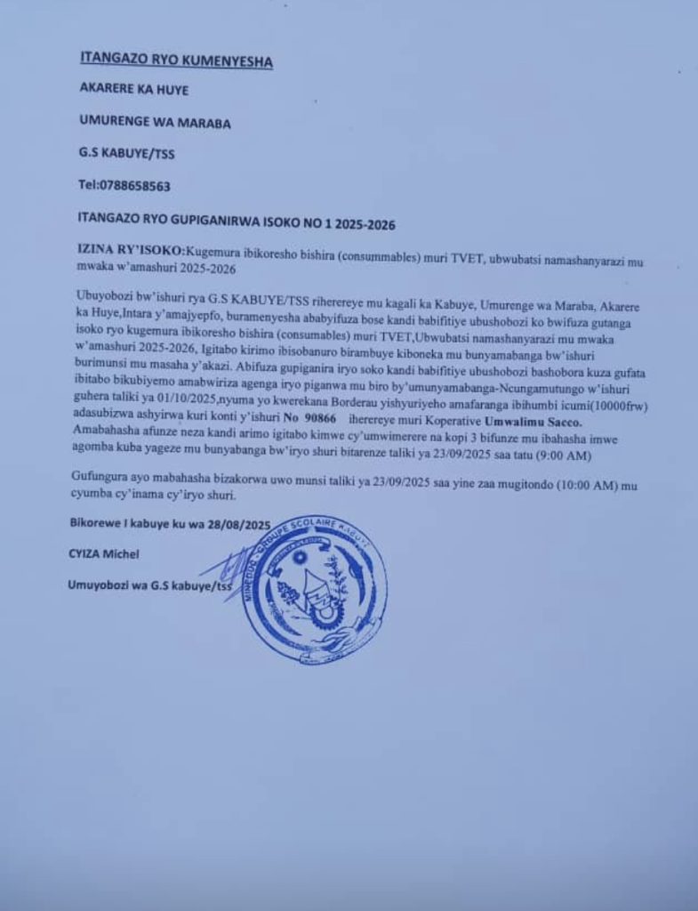 G.S. Kabuye TSS: Isoko ryo kugemura ibikoresho bishira bikoreshwa mu bwubatsi n’amashanyarazi (Deadline: 23/09/2025)