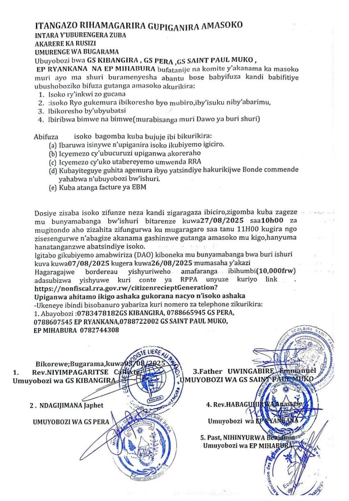 GS Kibangira, GS Pera, GS Saint Paul Muko, EP Ryankana, EP Mihabura: Isoko ryo kugemura ibikoresho by’ubwubatsi (Deadline: 27/08/2025)