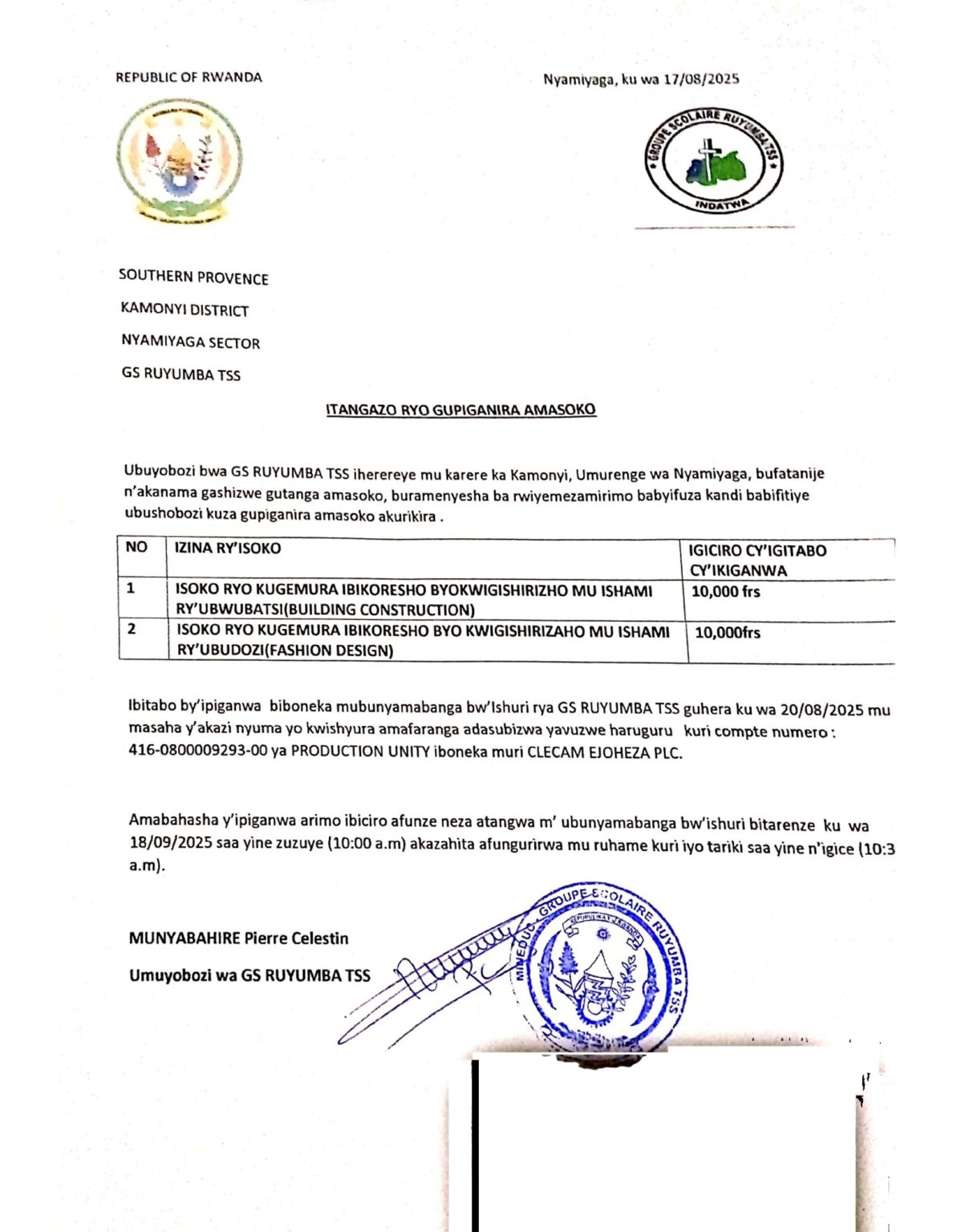GS Ruyumba TSS: Isoko ryo kugemura ibikoresho byo kwigishirizaho mu ishami ry’ubwubatsi (Deadline: 18/09/2025)