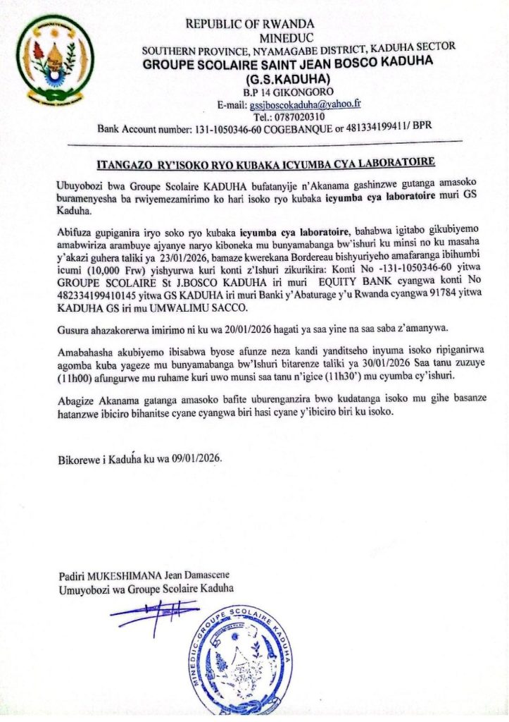 GS SAINT JEAN BOSCO KADUHA: Isoko ryo kubaka icyumba cya Laboratoire (Deadline: 30/01/2026)