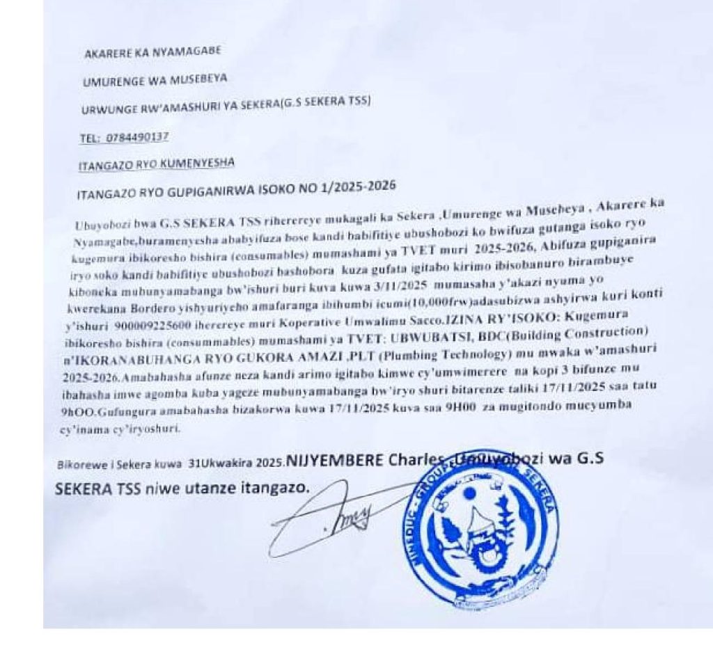 GS SEKERA TSS: Isoko ryo kugemura ibikoresho bishira mu mashami ya TVET muri 2025-2026 ( Deadline: 17/11/2025)