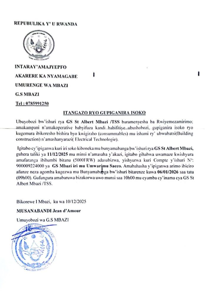 GS ST ALBERT MBAZI: Isoko ryo kugemura ibikoresho bishira byo kwigiraho mu ishami ry’ubwubatsi n’amashanyarazi (Deadline: 06/01/2026)