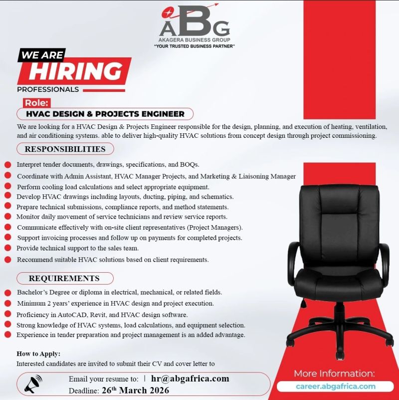 HVAC Design & Projects Engineer at Akagera Business Group (Deadline: 26/03/2026)