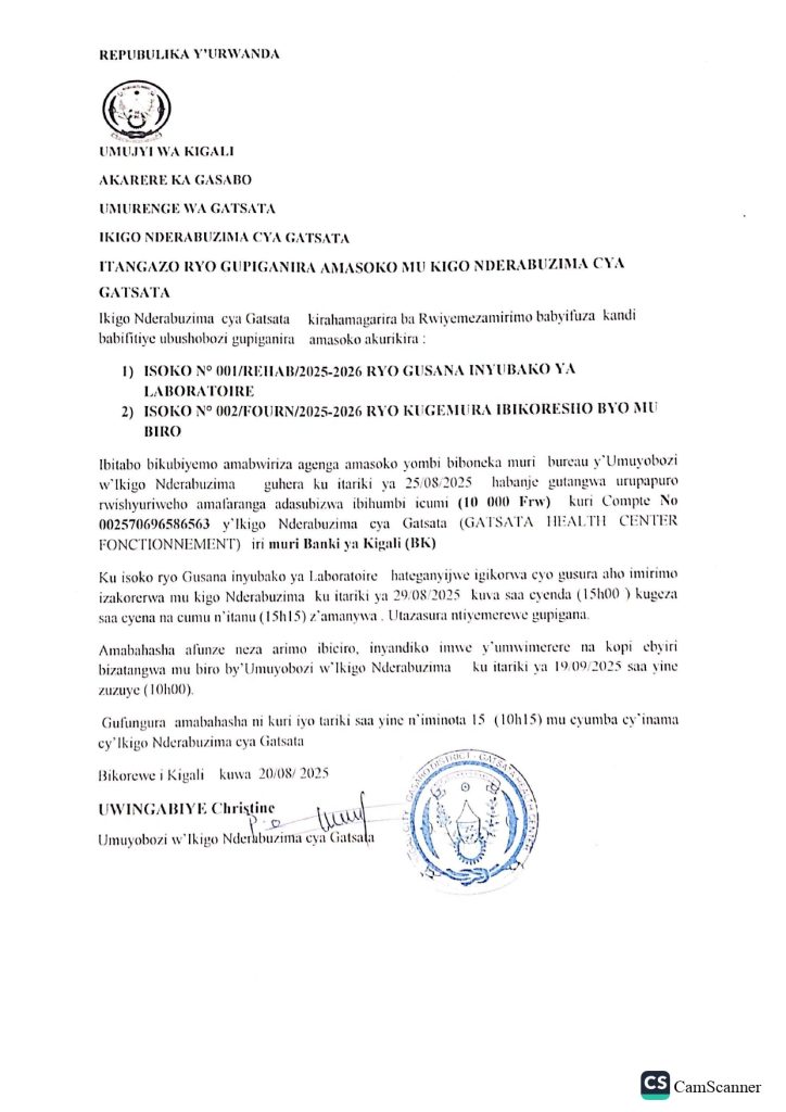 Ikigo Nderabuzima cya Gatsata: Isoko ryo gusana inyubako ya Laboratwari (Deadline: 19/09/2025)
