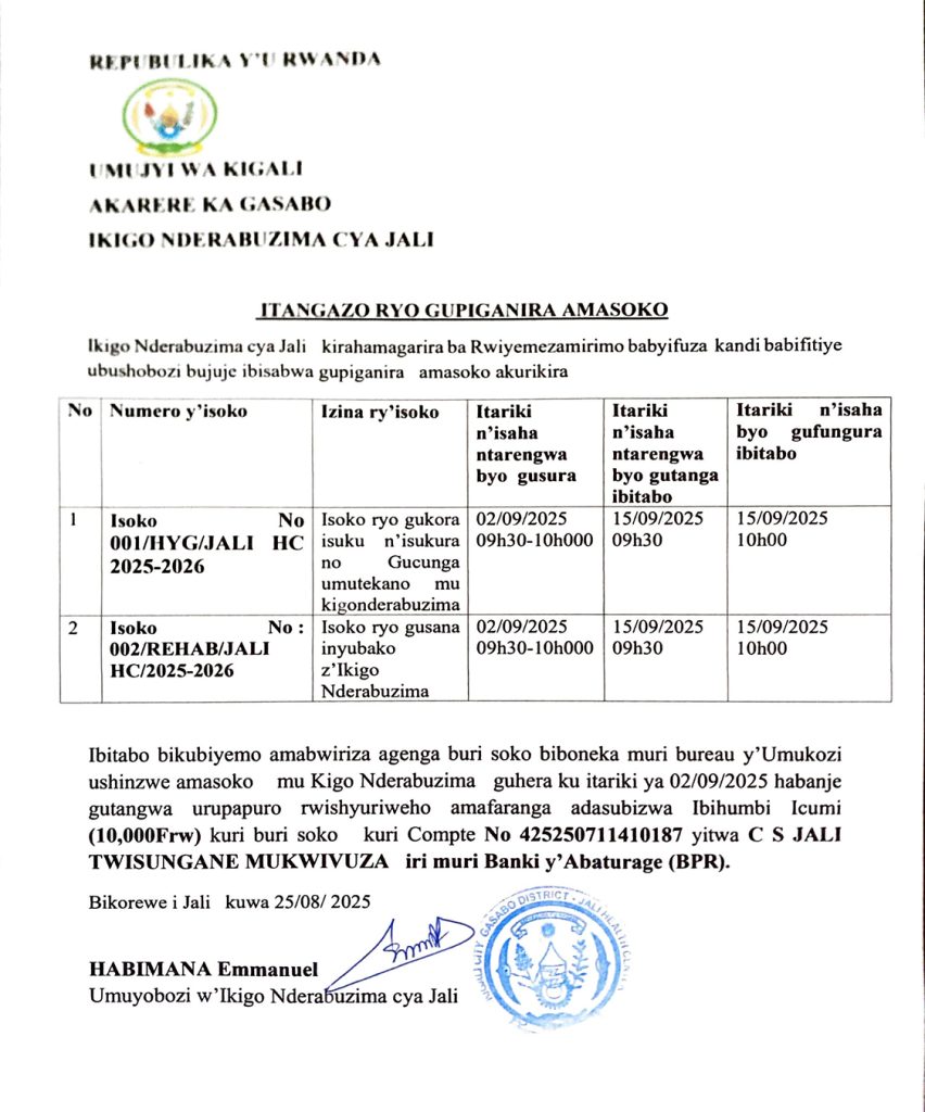Ikigo Nderabuzima cya Jali: Isoko ryo gukora isuku no gucunga umutekano, n’iryo gusana inyubako z’ikigo Nderabuzima (Deadline: 15/09/2025)