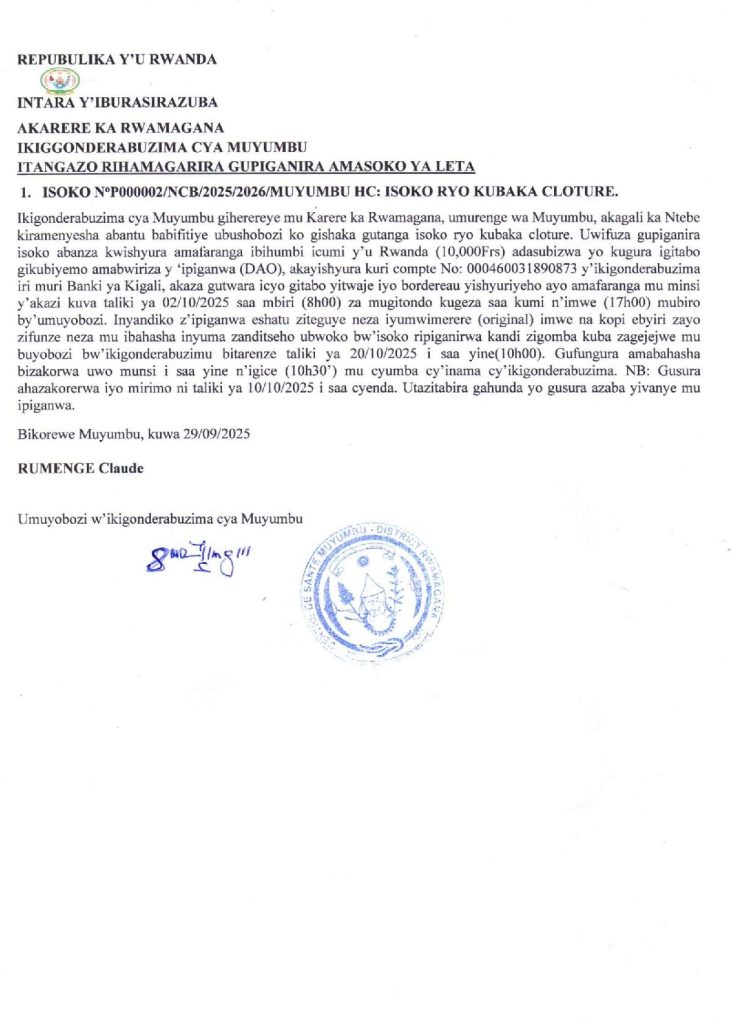 Ikigo Nderabuzima cya Muyumbu: Isoko ryo kubala uruzitiro (Deadline: 20/10/2025)