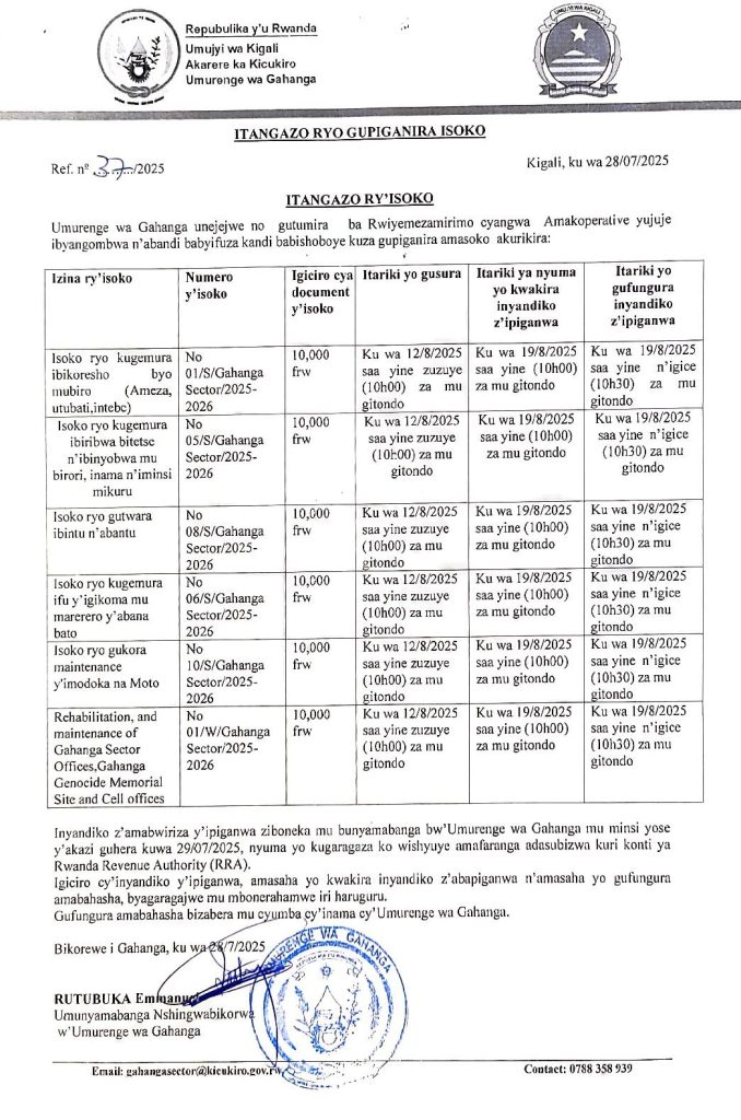 Isoko ryo kugemura ibikoresho byo mu biro (ameza, utubati, intebe)- Umurenge wa Gahanga ( Deadline: 19/08/2025)