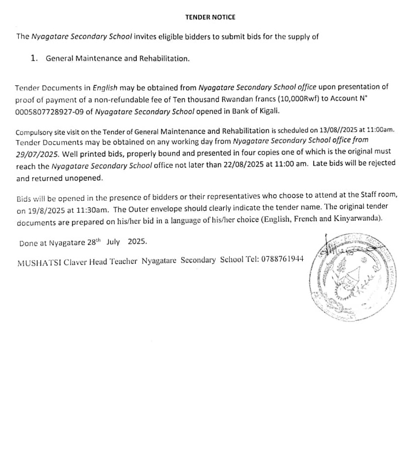 NYAGATARE SECONDARY SCHOOL: Tender notice for supply of General Maintenance and Rehabiliration ( Deadline: 22/08/2025)