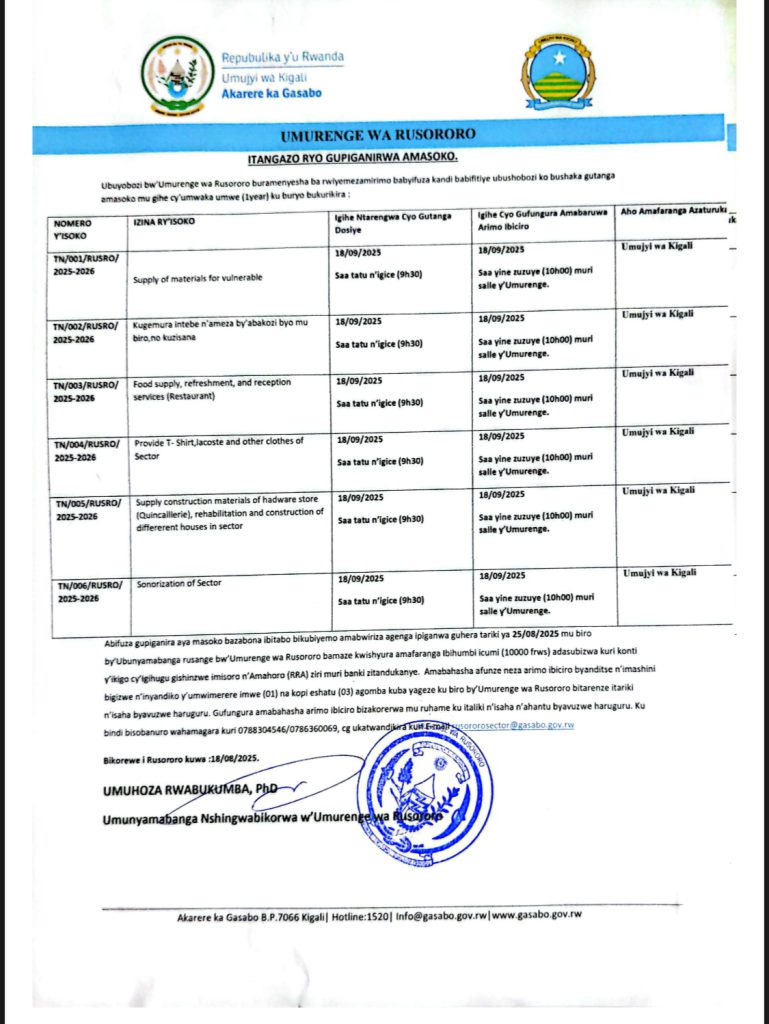 Rusororo sector: Tender for the supply of construction materials , rehabilitation and construction of different houses in the sector (Deadline: 18/09/2025)