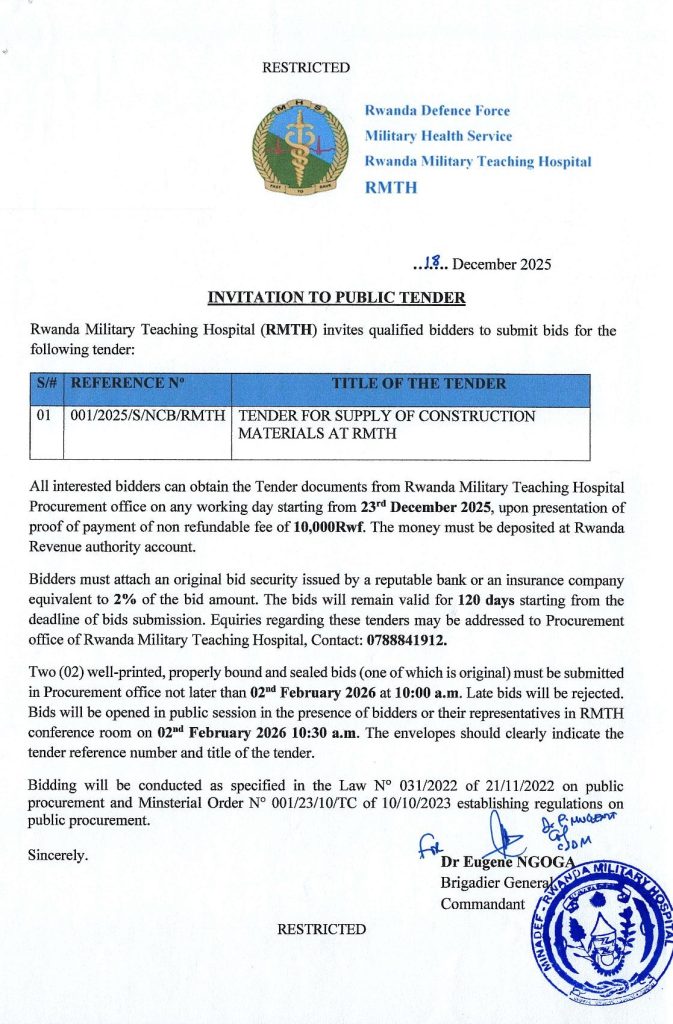 RWANDA MILITARY TEACHING HOSPITAL (RMTH): Tender for supply of Construction materials (Deadline: 02/02/2026)