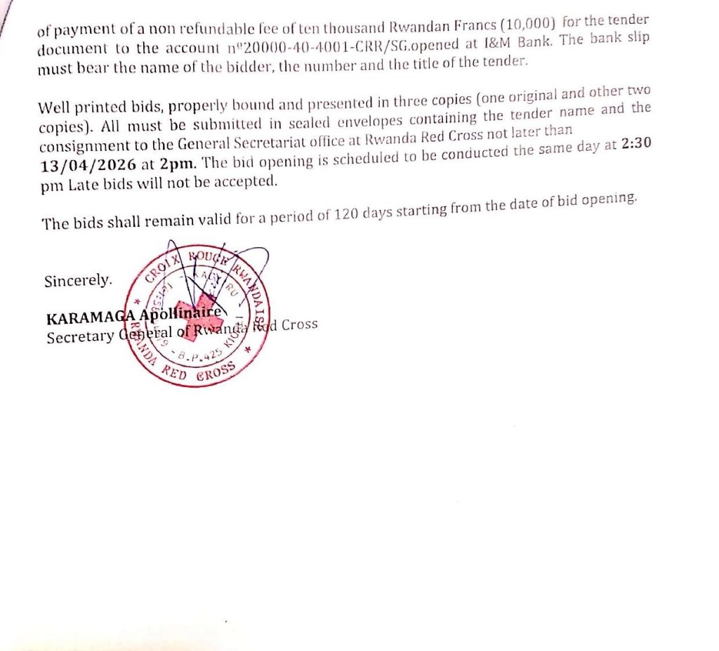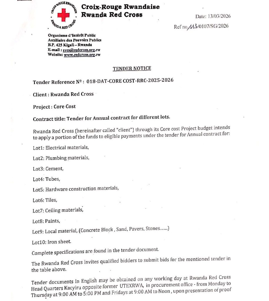 RWANDA RED CROSS: Tender for Annual contract for different lots (Deadline : 13/04/2026)