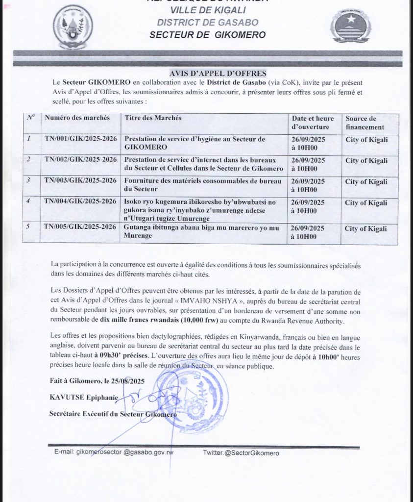Secteur de Gikomero: Isoko ryo Kugemura ibikoresho by’ ubwubatsi no gusana inyubako z’umurenge ndetse ni z’utugali tugize umurenge (Deadline: 26/09/2025)