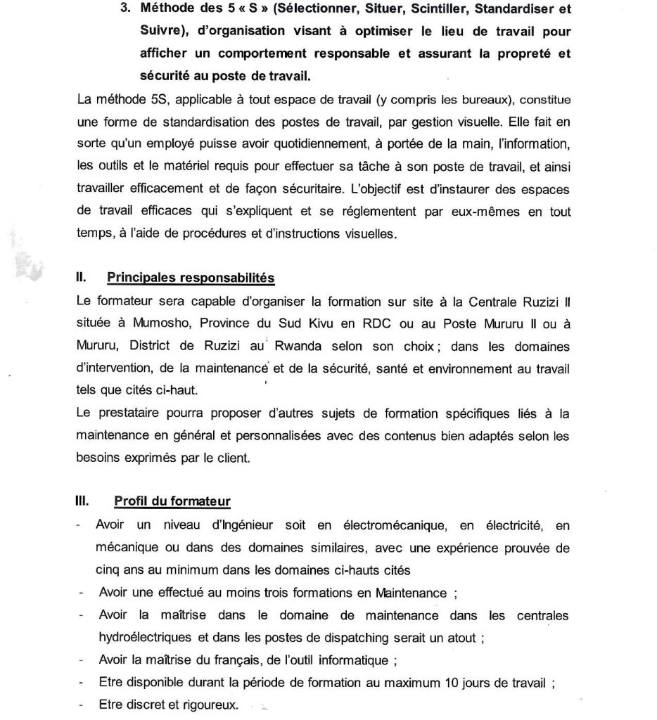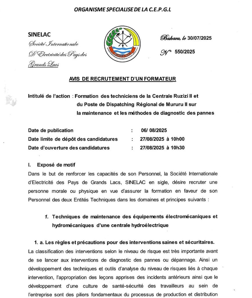 SINELAC: Avis d’appel d’offre du récrutement d’un formateur des techniciens de la Centrale Ruzizi II et du poste de Dispatching Régional de Mururu II sur a maintenance et les méthodes de diagnostic des pannes (Deadline:27/08/2025).