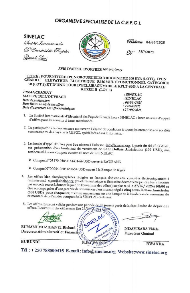 SINELAC: Avis d’appel d’offres pour la fourniture d’un groupe électrogène
