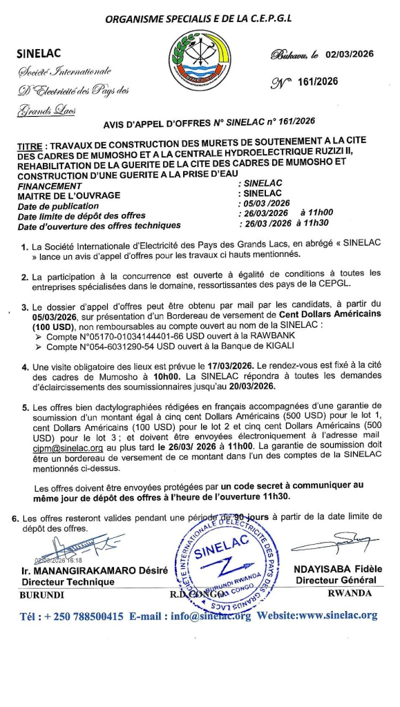 SINELAC: Avis d’appel d’offres pour les travaux de construction des murets de soutènement à la cité des cadres de Mumosho et à la centrale hydroélectrique Rusizi II, réhabilitation de la guérite de la cité des cadres de Mumosho et construction d’une guérite à la prise d’eau (Deadline : 26/03/2026)