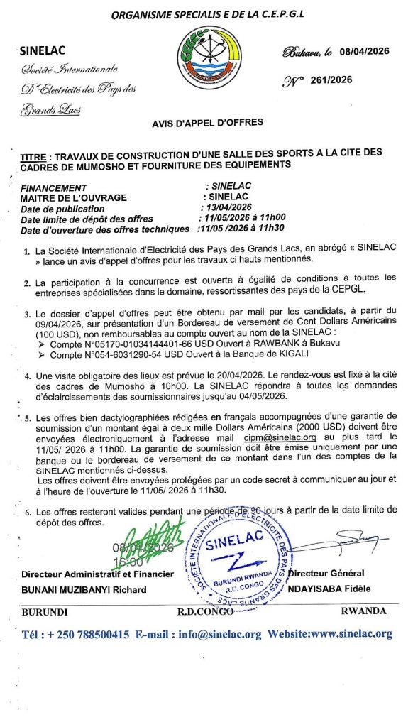 SINELAC: Avis d’appel d’offres pour les travaux de construction d’une salle des sports à la cité des cadres de Mumosho et fourniture des équipments (Deadline : 11/05/2026)