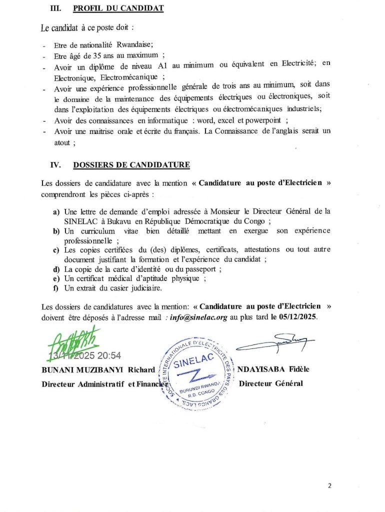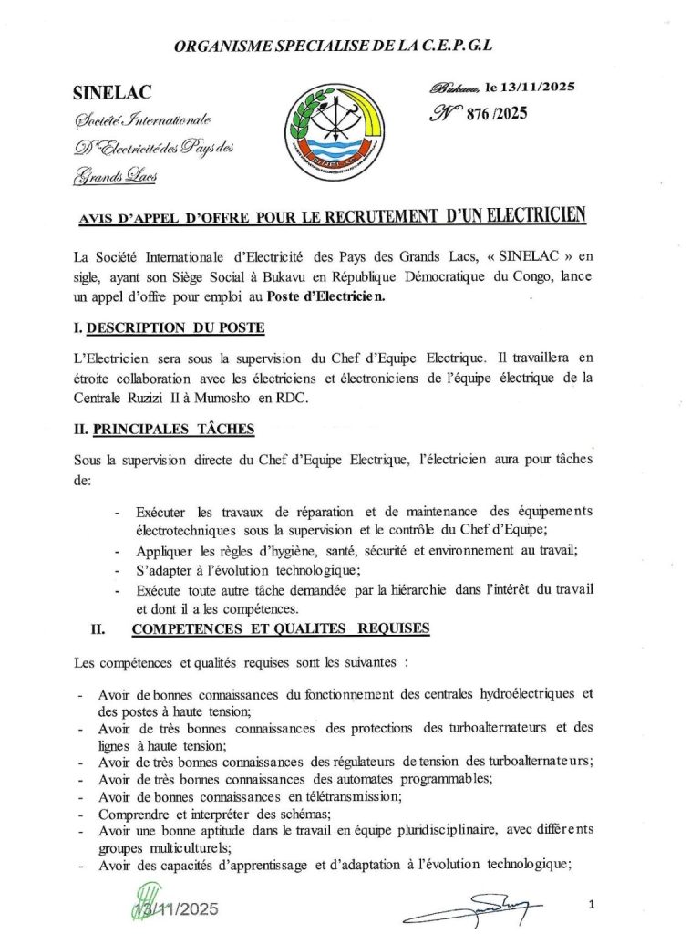SINELAC: Avis d’appel d’offre pour le recrutement d’un électricien ( Date limite: 05/12/2025)