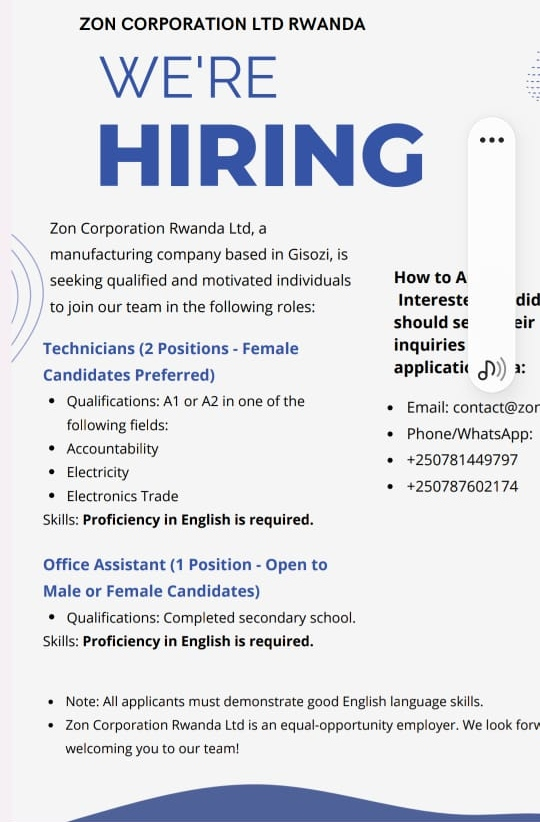 Zon Corporation Rwanda Ltd, a manufacturing company based in Gisozi, is seeking qualified and motivated individuals to join our team in the following roles: