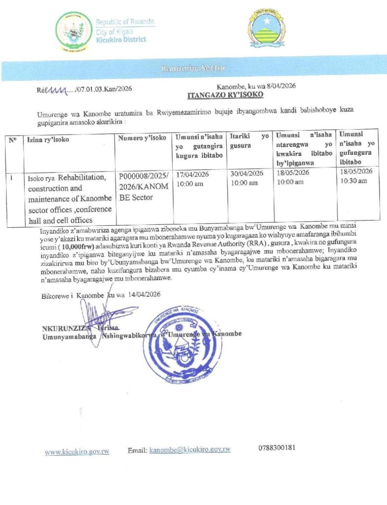 Tender for rehabilitation, construction and maintenance of Kanombe sector offices, conference hall and cell offices- Kanombe Sector (Deadline : 18/05/2026)
