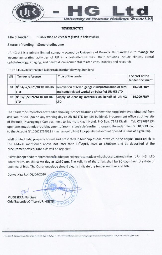 Tender notice for renovation of Nyarugenge clinic – University of Rwanda- Holdings Group Ltd (Deadline : 15/04/2026)