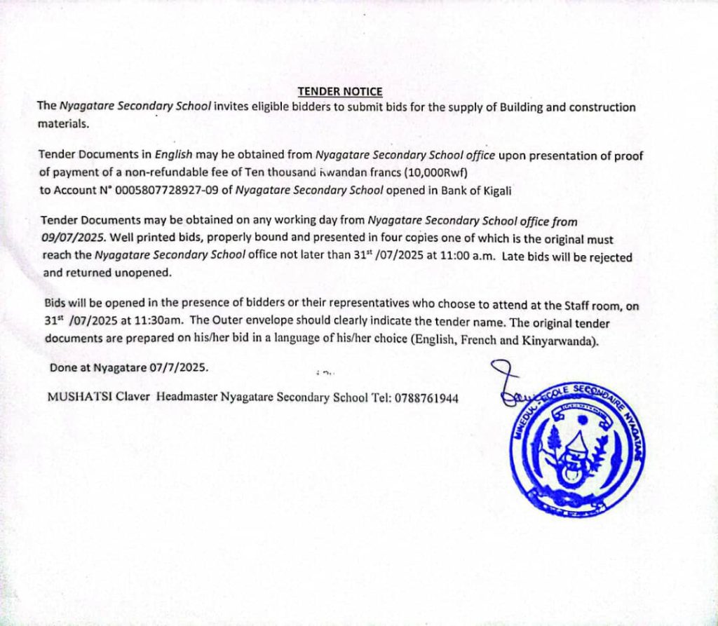 Tender notice for supply of building and construction materials at Nyagatare Secondary School (Deadline: 31/7/2025)