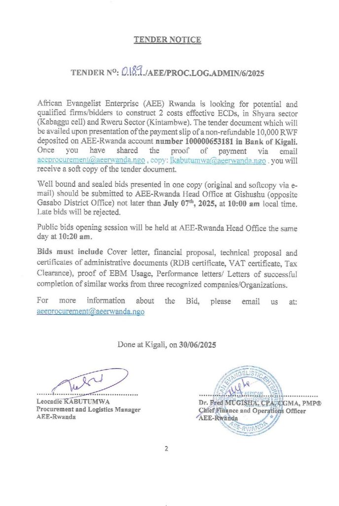 AEE RWANDA: Tender notice for the construction of 2 costs effective ECDs