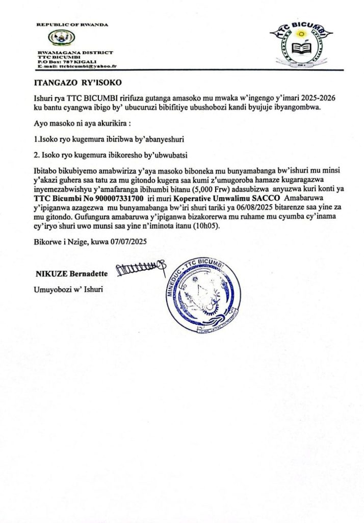 TTC BICUMBI: Isoko ryo kugemura ibikoresho by’ubwubatsi (Deadline: 06/08/2025)