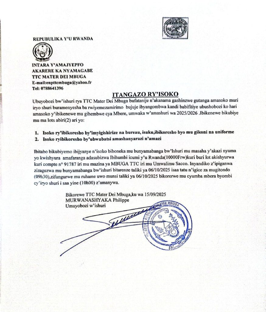 TTC Mater Dei Mbuga: Isoko ry’ibikoresho by’ubwubatsi, amashanyarazi n’amazi (Deadline: 06/10/2025)