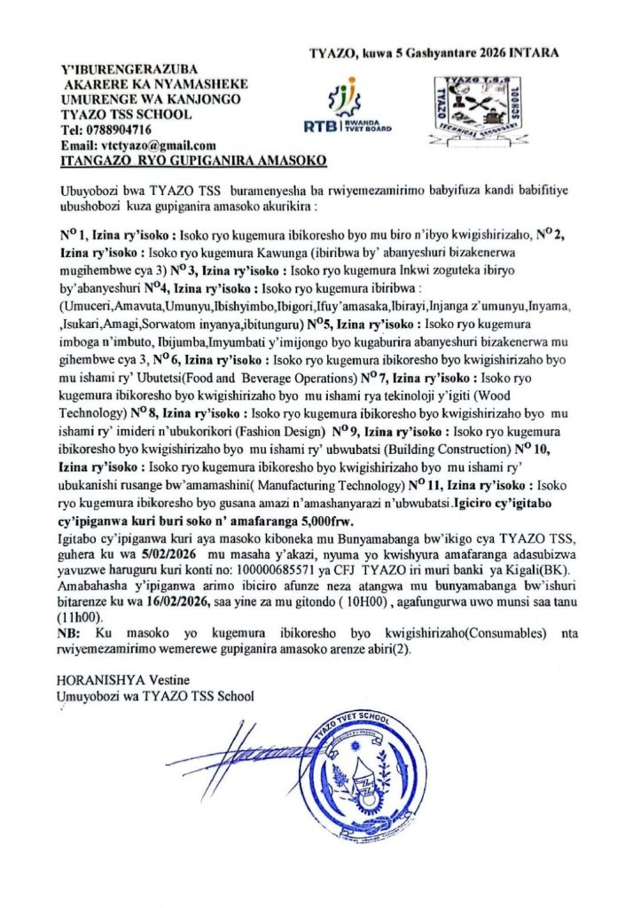 TYAZO TSS: Isoko ryo kugemura ibikoresho byo kwigishirizaho ubwubatsi, ibikoresho byo gusana amazi n’amashanyarazi n’ubwubatsi…(Deadline: 16/02/2026)
