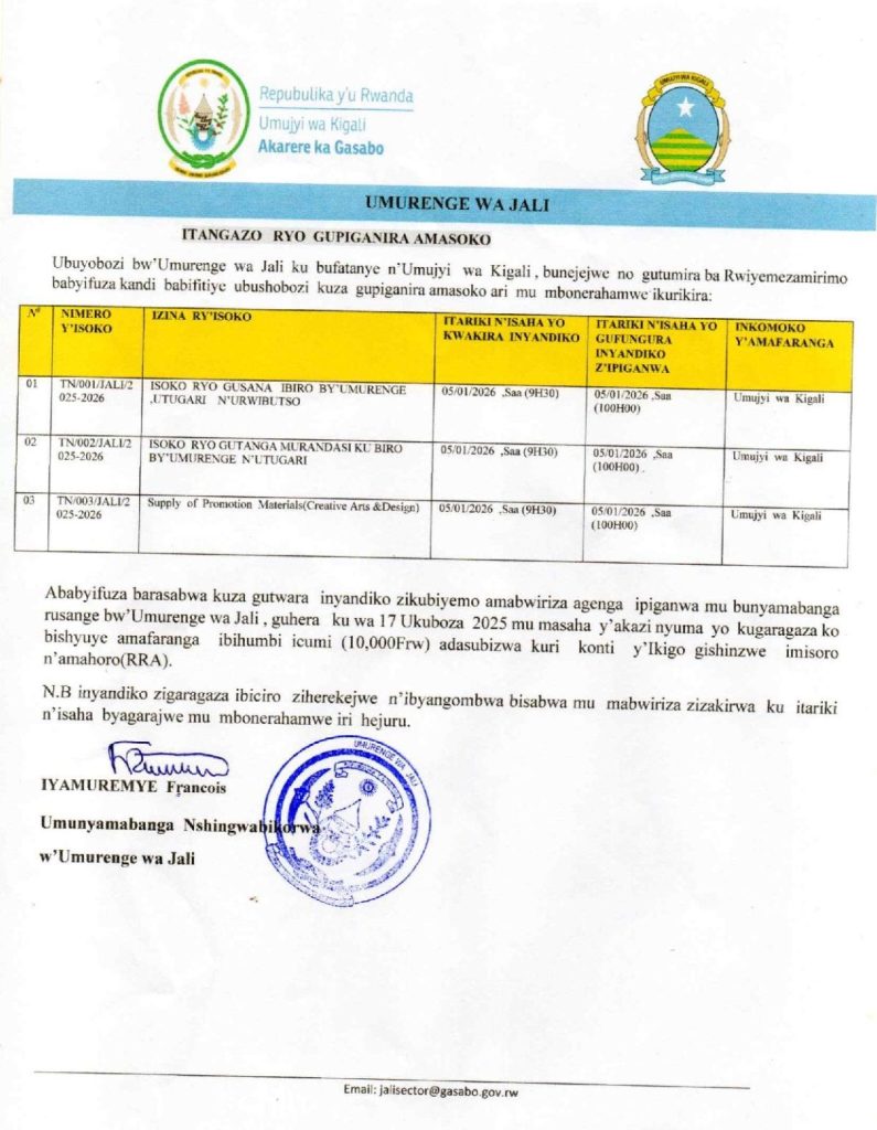 UMURENGE WA JALI: Isoko ryo gusana ibiro by’umurenge, utugari n’urwibutso (Deadline: 05/01/2026)