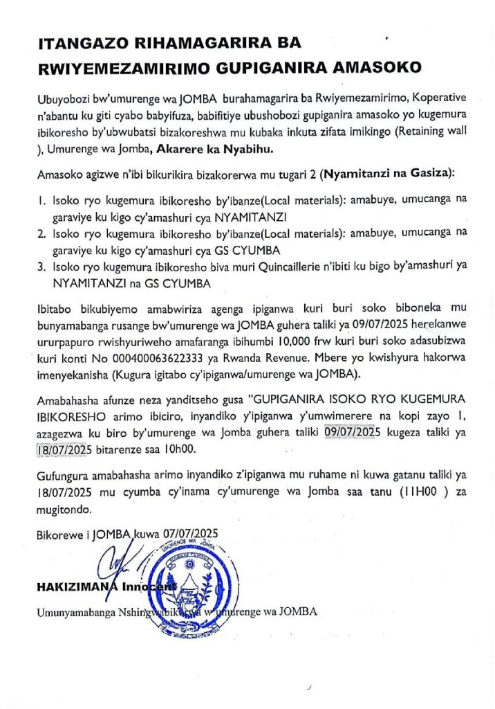 Umurenge wa Jomba: Isoko ryo kugemura ibikoresho by’ibanze (local materials): amabuye, umucanga na garaviye ku kigo cy’amashuri cya GS Cyumba (Deadline: 18/07/2025)