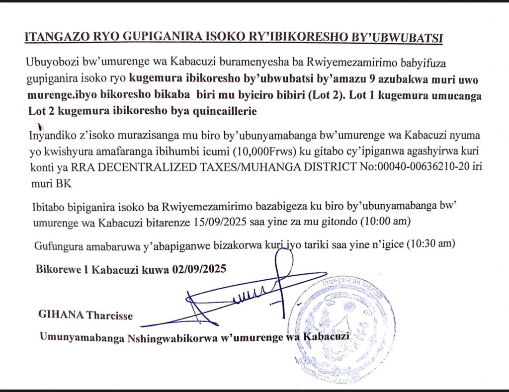 Umurenge wa Kabacuzi: Isoko ryo kugemura ibikoresho by’ubwubatsi by’inzu 9, birimo umucanga n’ibya quincaillerie (Deadline: 15/09/2025)