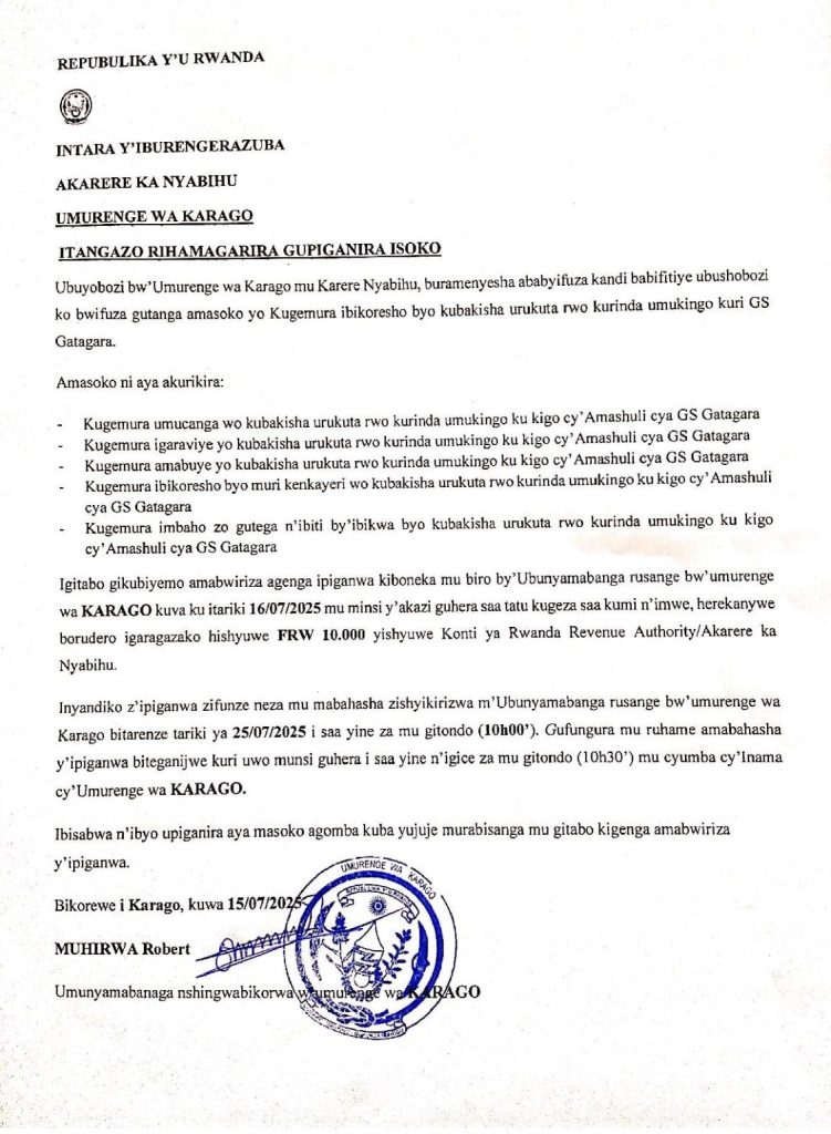 UMURENGE WA KARAGO: Isoko ryo kugemura ibikoresho byo kubakisha urukuta rwo kurinda umukindo kuri GS Gatagara (Deadline: 25/07/2025)