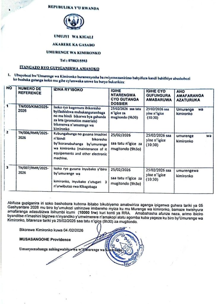 UMURENGE WA KIMIRONKO: Isoko ryo gusana inyubako y’ibiro by’umurenge, inyubako z’utugari 3 n’urwibutso rwa Kibagabaga (Deadline: 25/02/2026)