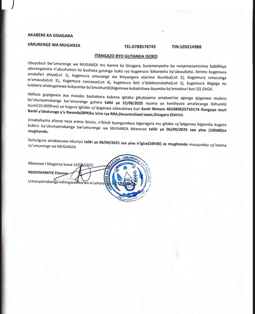 Umurenge wa Muganza: Isoko ryo kugemura ibikoresho by’ubwubatsi birimo amatafari ahiye, umucanga wa Kinyangara utarimo ibumba, umucanga w’amavuta, concasse, ibiti n’ibibikomokaho, ibigega no kubitera (Deadline: 06/09/2025)
