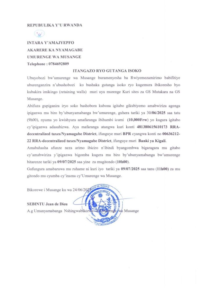 Umurenge wa Musange: Isoko ryo kugemura ibikoresho byo kubakira imikingo kuri site za GS Mutakara na GS Musange ( Deadline : 09/07/2025)