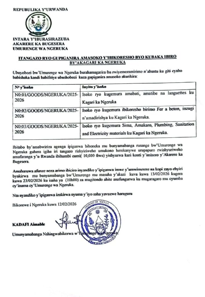 UMURENGE WA NGERUKA: Isoko ryo kugemura ibikoresho byo kubaka ibiro by’Akagari ka Ngeruka (Deadline: 23/02/2026)