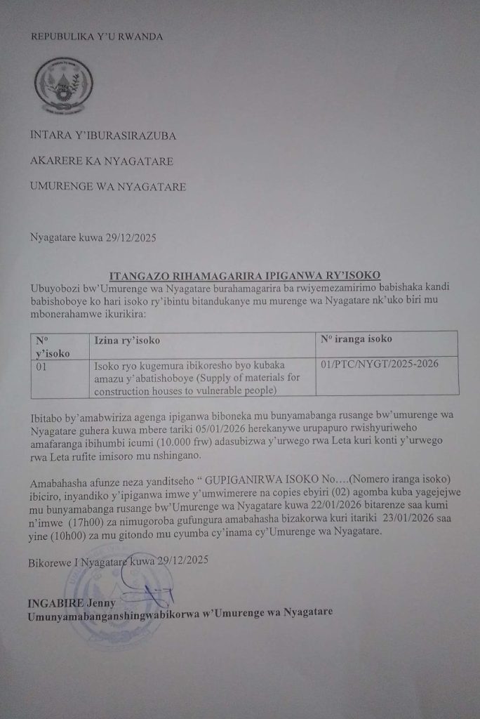 UMURENGE WA NYAGATARE: Isoko ryo kugemura ibikoresho byo kubaka amazu y’abatishoboye (Deadline: 22/01/2026)