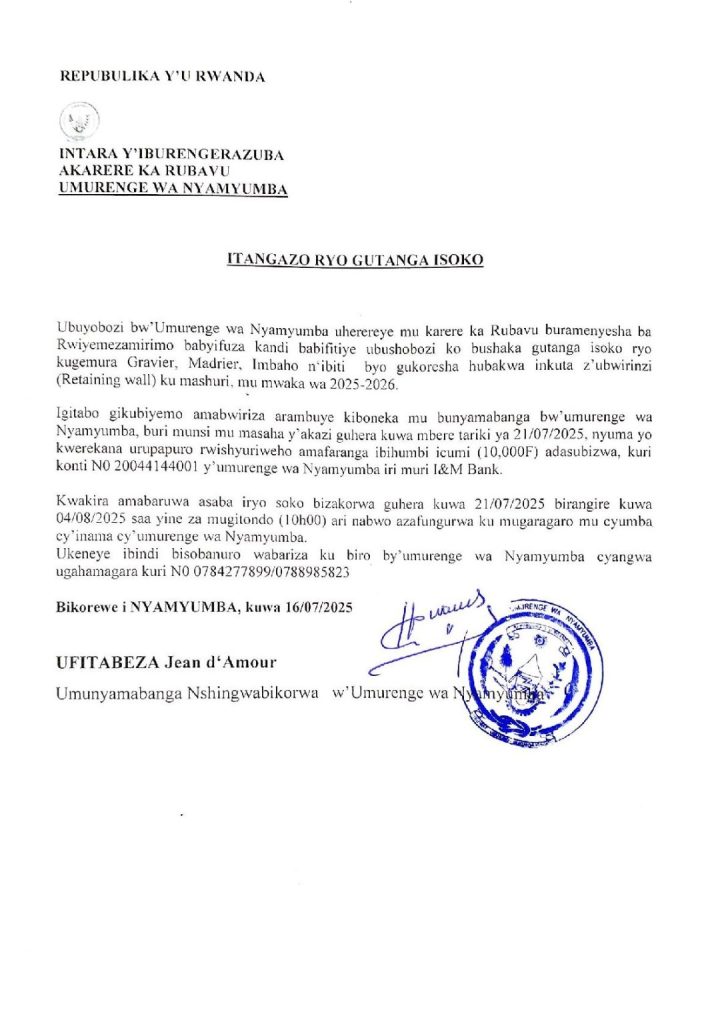 UMURENGE WA NYAMYUMBA: Isoko ryo kugemura gravier, madrier, imbaho n’ibiti byo gukoresha hubakwa inkuta ku mashuri mu mwaka wa 2025-2026 (Deadline: 04/08/2025)