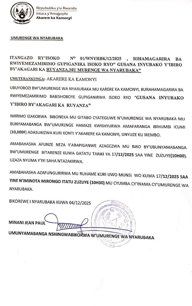 UMURENGE WA NYARUBAKA: Isoko ryo gusana inyubako y’ibiro by’Akagari ka Ruyanza (Deadline: 17/12/2025)
