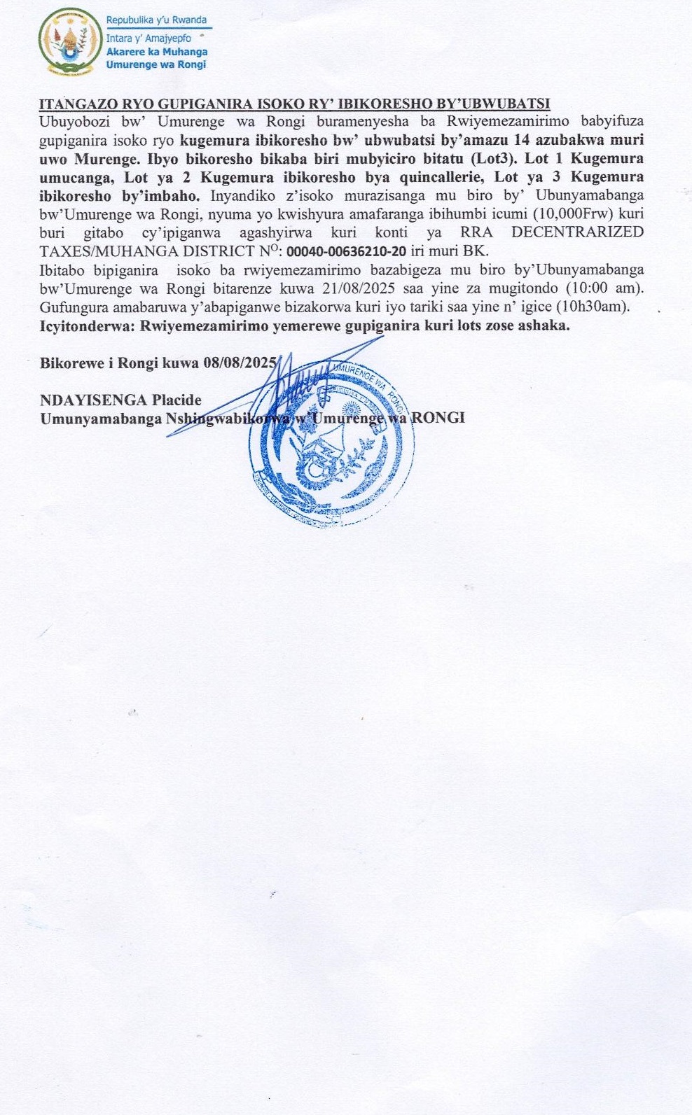 UMURENGE WA RONGI: Isoko ryo kugemura ibikoresho by’ubwubatsi by’amazu 14 azubakwa muri uwo murenge (Deadline: 21/08/2025)