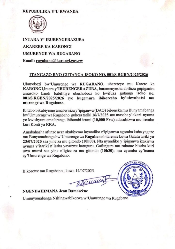 UMURENGE WA RUGABANO: Isoko ryo kugemura ibikoresho by’ubwubatsi ( Deadline: 23/07/2025)