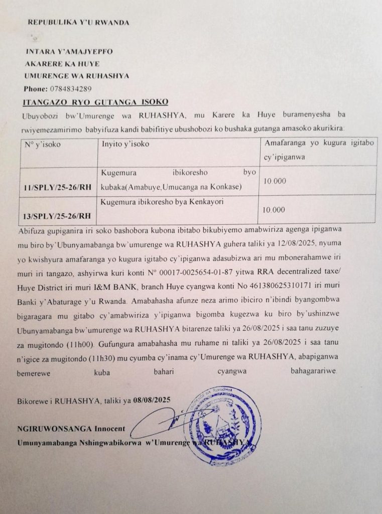 UMURENGE WA RUHASHYA: Isoko ryo kugemura ibikoresho byo kubaka n’ibya Kenkayori (Deadline: 26/08/2025)